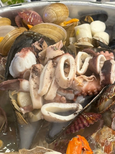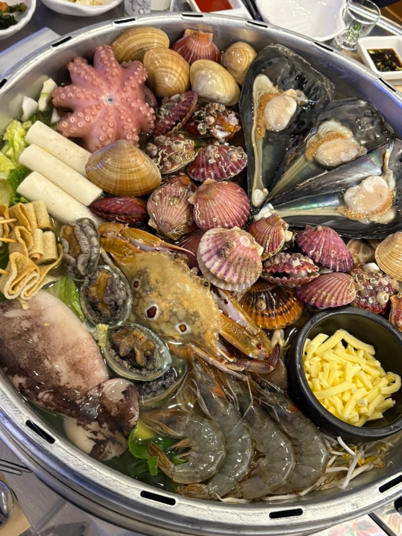 오징어, 새우, 오징어, 조개, 전복, 굴, 오뎅, 떡, 치즈, 숙주, 문어인가 쭈꾸미인가,, (?)등등